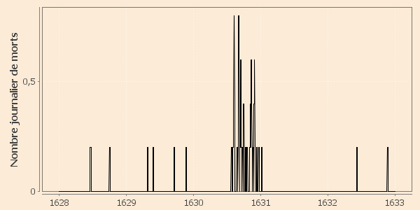 Les archives ne semblent présenter que la période réputée d’épidémie. Celle-ci se manifeste sous la forme de trois épisodes débutant relativement rapidement pour s’atténuer progressivement et donc présenter une certaine indépendance. L’épidémie, durant plus de 5 mois, serait de type rural.