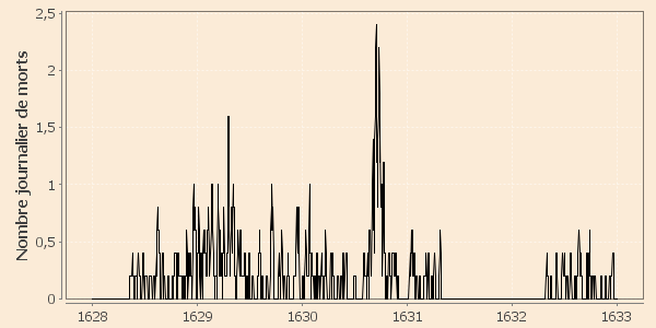 Mortalité naturelle annuelle : 60 (estimée sans tenir compte de l’important épisode de surmortalité de fin 1628 et du premier tiers de 1629).