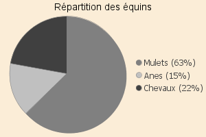 En complément et pour gagner de la place dans la page, la répartition des équins en 1734 est donnée dans le premier graphique suivant. Manifestement les mulets sont de loin les plus nombreux représentant deux tiers des équins. Les chevaux constituent un peu plus d'un cinquième, les ânes restant minoritaires et principalement affectés aux maisons relativement pauvres quand ils sont seuls.