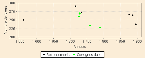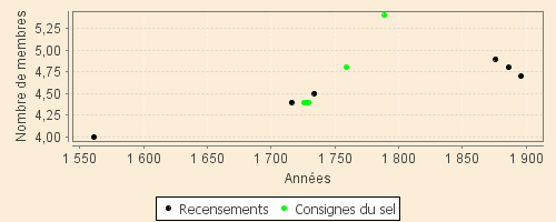 Ces valeurs, bien qu’approximatives, paraissent cependant logiques à la vue du graphique du nombre moyen de personnes par regroupement qui fluctue assez peu soit 4 au recensement de 1561 quand la population de la paroisse semble se reconstituer à 5 à la consigne du sel de 1789 quand la population semble sortir d'une phase de creux où le nombre des regroupements reste relativement faible. Mais peut-être s'agit-il, aussi, de l'effet du mode d'enregistrement des consignes du sel.