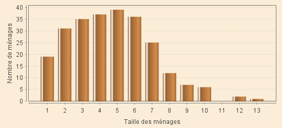 Il traduit une augmentation de la proportion des regroupements moyens (3 à 6 personnes). Le pic à 4 personnes passe à 5 mais dans une répartition relativement très homogène. Une analyse plus détaillée montre que cette nouvelle répartition est due à de nombreux célibataires vivant seuls ou presque (1 à 3 personnes) ou en cohabitation avec des familles ordinaires (à plus de 4 personnes).