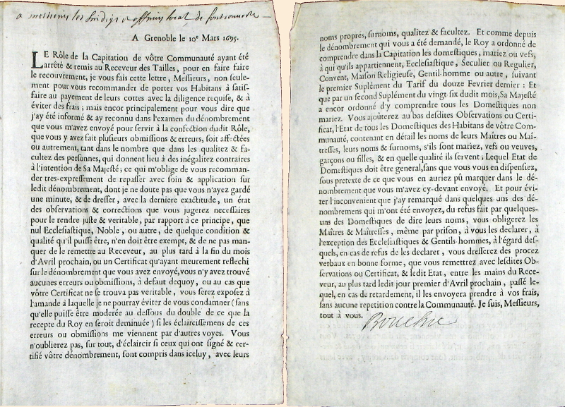 En réponse aux remarques de l'Intendant du roi de France à Grenoble sur la consigne initiale qui lui a été transmise pour la capitation de 1695...