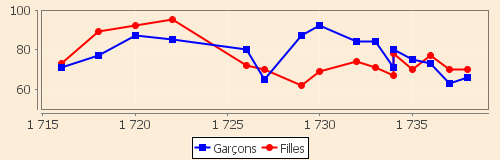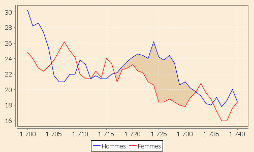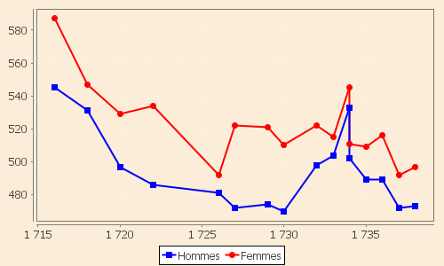 Leurs évolutions entre 1716 et 1738 sont relativement parallèles pour les deux sexes jusqu’en 1730, date à partir de laquelle apparaît le rebond sur les seuls hommes conformément au déficit reconnu comme très net des naissances féminines par rapport aux masculines entre 1720 et 1733.