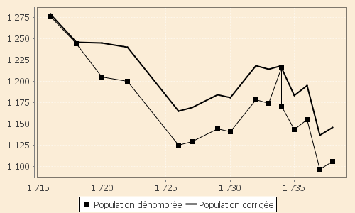 Le graphique donne alors, en comparaison de la population dénombrée à partir des consignes, la population probable réelle. Les points de 1727, 1729 et 1734 sont corrigés des sous-enregistrements constatés, les points des recensements de 1716, 1718 et 1734 ne subissent pas de correction puisqu'ils donnent le détail de tous les enfants sans probabilité de sous-enregistrement marquant. Tous les autres points sont simplement affectés d'une correction de +40 individus.