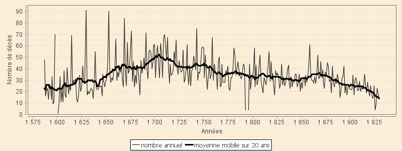Pendant ce temps, les décès atteignent un pic vers 1710 (avec 52 décès annuels) suivi d'une décroissance plus ou mons régulière mais continue jusqu'en 1900 (avec 25 décès annuels).