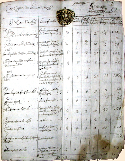 Quant aux familles de types 3, 4 et 5 qui sont de loin les plus nombreuses, leurs proportions estimées dans la consigne de 1726 sont pratiquement les mêmes que celles du recensement de 1716.