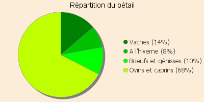L'activité pastorale est largement dominée par l'élevage des ovins et des caprins soit 68 % des têtes de bétail. Il est probable, à la vue d'autres dénombrements, que les brebis soient largement prédominantes.