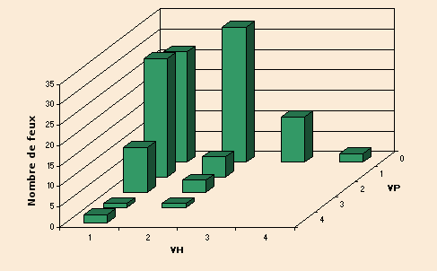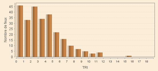 La proportion des « feux » est, en gros, régulièrement décroissante en fonction du TRI. Trois quarts des « feux » s'établissent avec un TRI inférieur à 5. Le nombre de « feux » décroit progressivement pour les valeurs de TRI compris entre 6 et 11, les valeurs supérieures ne représentant qu'une proportion infime et sans signification sociale.