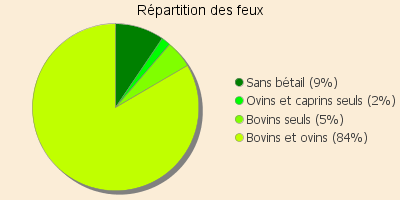 La très grande majorité des « feux » (84 %) a l'habitude d'élever simultanément ovins, caprins et bovins. 2 % des « feux » se contentent de brebis et/ou chèvres. Mais 9 % des « feux » ne possèdent aucun bétail.