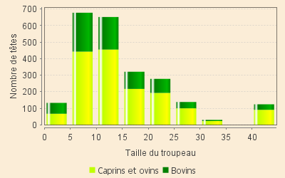 La taille des troupeaux s'étend de 1 à un peu plus de 40 têtes. Cependant, 56 % des bêtes se trouvent dans des troupeaux de 5 à 14 têtes et 6 % font partie des troupeaux de moins de 5 bêtes. Malgré leur taille, les gros troupeaux de plus de 35 bêtes ne représentent que 5 % du cheptel.