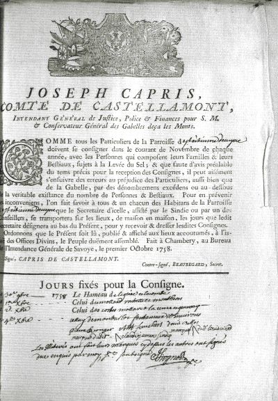 La consigne de 1759 précise qu'un complément de sel de 203 livres (ne représentant que 1,4 % du sel calculé pour 1759) est à répartir pour atteindre les 84 balles exigées par l'Intendant général dans son ordonnance du 19 novembre 1749. Le secrétaire de la communauté a réalisé la répartition du complément de façon à faire supporter ce supplément par les feux les plus aisées, en fait les plus imposables.