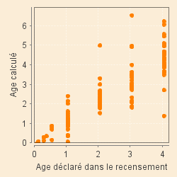 Le graphique corrélant les âges réels calculés à partir de la structuration de la population à ceux donnés dans la consigne montre que ces derniers voudraient être des âges révolus. Il apparaît cependant de nombreux écarts à cette définition, écarts que l'on retrouve identiques jusque dans les recensements plus tardifs, même au XIXe siècle, traduisant la méconnaissance de leur âge exact par les Fontcouvertins ou le peu d'intérêt qu'y porte le rédacteur du dénombrement. Ce fait paraît étonnant dans une consigne du sel dont le but est la détermination des mineurs de 5 ans exonérés de l'impôt... à moins qu'il ne s'agisse que d'un moyen d'y échapper !
