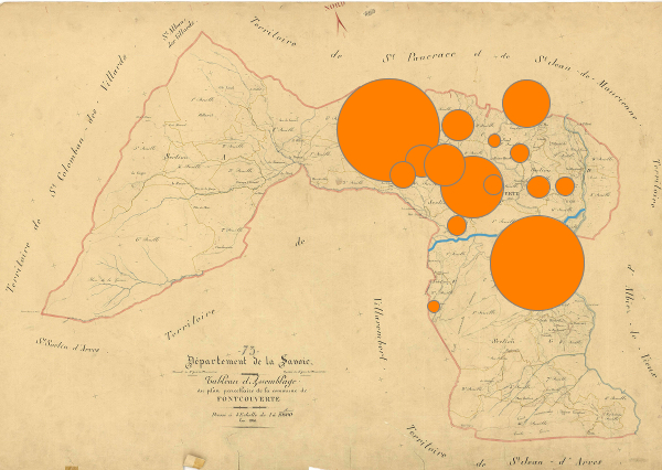 En glissant la souris au centre de chaque cercle il apparait sur la carte le nom du village, le nombre de ses maisons, celui de ses « familles » ainsi que sa population.