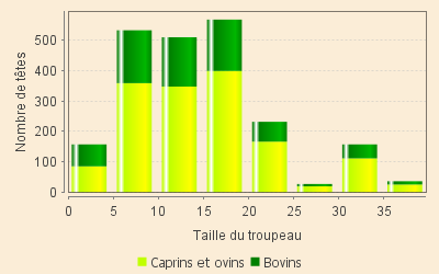 Quelle que soit la taille des troupeaux, les ovins et caprins représentent de façon homogène 70 % du total. Seuls les petits troupeaux (moins de 5 bêtes) ont approximativement autant de bovins que d'ovins.
