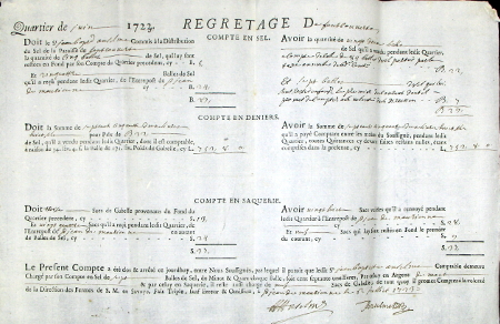 Enfin, le regretier tient, chaque trimestre (quartier), une comptabilité de son stock de sel exprimé en quantité de sel, en deniers et en sacs et de ce qui lui reste à enlever au grenier royal du trimestre écoulé.