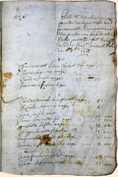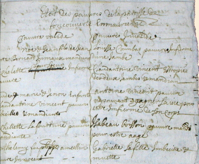 Le document que nous avons eu entre nos mains précise pour chaque maison les noms et prénoms des habitants ainsi que les relations familiales qu’ils entretiennent entre eux. Sont également mentionnés l’âge des personnes et, éventuellement, leur état de santé ainsi que leur état de pauvreté qui pourrait les dispenser de la taxe du sel. Un récapitulatif des pauvres et mendiants est fourni, distinguant les valides et les invalides, dans la mesure où ne sont pas soumis à la gabelle les personnes réputées pauvres n’ayant pas les moyens physiques de subvenir à leurs besoins.