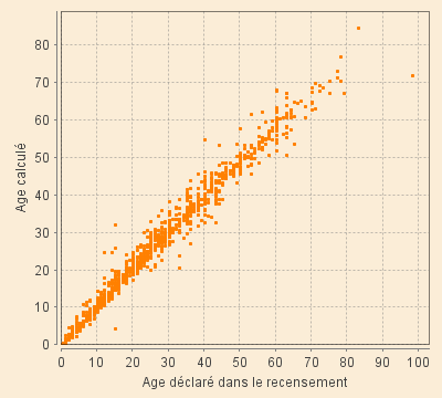 Dans le détail et concernant les âges les plus faibles qui devraient être les mieux connus, le graphique des âges réels en fonctions des âges (révolus) du recensement confirme l’imprécision de ± 1 an, voire plus.