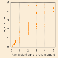 Les âges des enfants de moins de 1 an apparaissent logiquement alignés sur la bissectrice des axes ; ils correspondent aux âges exprimés en mois dans le recensement. Pour le reste, on peut donc s'attendre à obtenir un nombre inexact d'enfants par année d'âge à partir du recensement, anomalie qui s'estomperait dans la pyramide des âges pour la tranche globale 0 - 5 ans.