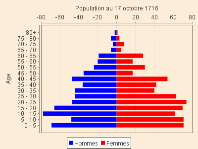 L'estimation de la proportion des mineurs de 5 ans dans la population totale par le recensement de 1716 conduit au nombre de 147 mineurs alors que le nombre donné par le recensement est de 144, valeur que nous retenons, la première pouvant être estimée par très léger excès. En tout cas, la méthode d'estimation est ici validée avec une précision suffisante pour nos études.