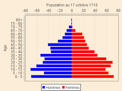 Elle porte sur les seules 1 239 personnes présentes qui ont pu être identifiées dans la structuration de la population et dont l'âge a pu être calculé à partir de leur date de naissance. La pyramide est alors amputée des personnes très peu nombreuses (3 %) qui n'ont pu être identifiées mais évite les erreurs d'âge du recensement.
