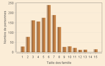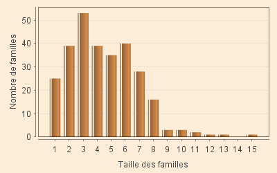 Près des deux tiers des « familles » (72 %) comportent, de façon assez uniforme, un nombre de personnes compris entre 2 et 6 avec une fréquence maximale pour 3 personnes. Le nombre de « familles » décroît rapidement à partir de 7 personnes pour s'effondrer dans une suite ne représentant pratiquement plus que des exceptions.