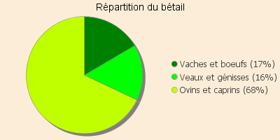 L'élevage des ovins et caprins est très largement dominant soit les deux tiers du cheptel (exactement 68 % des têtes de bétail). Le dernier tiers (32 %) restant concerne les bovins se répartissant pour moitié dans les bœufs et vaches et pour l'autre moitié en veaux et génisses.