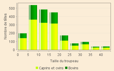 La taille des troupeaux s'étend de 1 à un peu plus de 40 têtes. Cependant, 70 % des bêtes se trouvent dans des troupeaux de 5 à 19 têtes et 9 % font partie des troupeaux de moins de 5 bêtes. Avec leur taille, les gros troupeaux de plus de 25 bêtes ne représentent que 13 % du cheptel. Les gros troupeaux auraient relativement mieux résisté à l'épizootie ou, plutôt, se seraient reconstitués plus vite que les petits troupeaux.