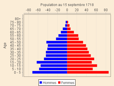 En l'absence de toute mention d'âge dans le document, la pyramide des âges ne peut être établie que pour les personnes qui ont été identifiées dans la structuration de la population. 95 % de la population ayant pu l'être, la pyramide est, sinon parfaitement exacte, du moins très représentative de la réalité. Elle présente en tout cas une régularité étonnante qu'on n'attendrait pas d'une population de seulement un millier d'individus. La seule particularité concerne les filles de moins de 5 ans qui apparaissent en nombre important, conforme pourtant à l'estimation que nous faisons des mineurs ci-dessus. Ce sont au contraire les garçons qui souffrent d'un manque d'identification ou qui auraient été soumis à un sous-enregistrement. Dans la régularité de la pyramide, ce serait donc plutôt un déficit des classes 5 - 15 ans qui serait à relever.