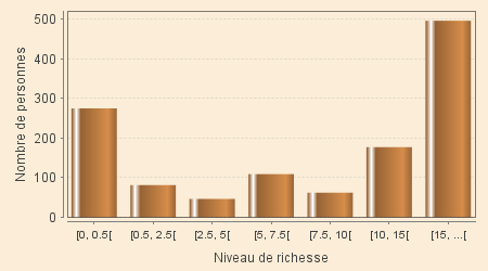 La répartition des « feux » et celle des personnes par niveaux de richesse reproduisent, naturellement, le graphique précédent. Mais les graphiques montrent clairement, par leurs répartitions très particulières, ce qu'a réaliser le recenseur. Plus de 100 « feux » seraient dans la richesse et à peine moins seraient dans l'extrême pauvreté ! Ce qui est absurde.