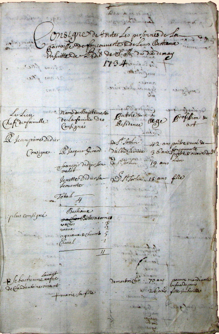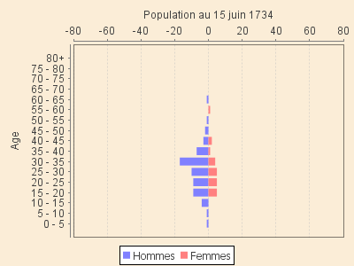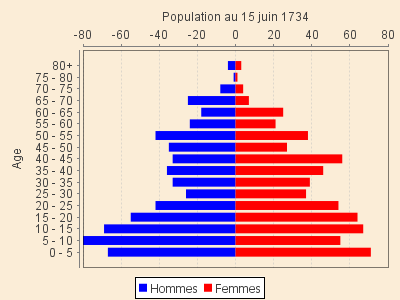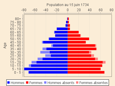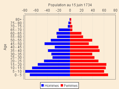 Nous avons retenu la date du 15 juin 1734 pour le calcul des âges au moment du recensement, date parfaitement confirmée par les naissances et décès connus au voisinage de cette époque dans la structuration de la population.