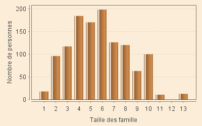 Les trois quarts des « familles » comportent un nombre de personnes compris entre 2 et 6 avec une fréquence privilégiée pour 2 à 4 personnes. Le nombre de « familles » décroît rapidement à partir de 7 personnes pour s'effondrer au delà de 10. Les « familles » d'une seule personne ne représentent que 7 %.