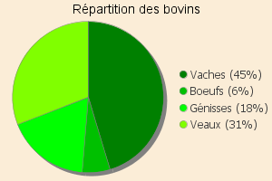 Les vaches, représentant à elles seules près de la moitiée des bovins, sont naturellement les plus nombreuses puisqu'elles sont la finalité principale de l'élevage.