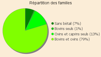Quant à la répartition des « familles » en fonction du bétail qu'elles détiennent (équins exclus), plus des trois quarts d'entre elles possèdent simultanément bovin, ovins et caprins ce qui constituerait une règle presque gnérale. Les troupeaux de bovins seuls sont quasi anecdotiques (1 %) alors que les « familles », probablement trop pauvres pour entretenir ne serait-ce qu'une vache, représentent 13 % des « familles ». On n'oublie pas que 7 % des « familles » n'ont aucun bétail.