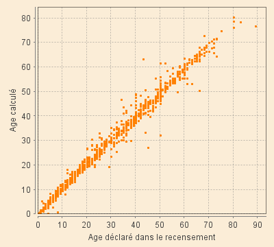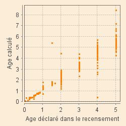 Les âges des enfants de moins de 1 an et de 1 an et demi apparaissent logiquement alignés sur la bissectrice des axes ; ils correspondent aux âges exprimés en mois dans le recensement. Les écarts importants révèlent les erreurs de recensement, en particulier la confusion entre mois et années : par exemple, un enfant déclaré avoir 4 ans dans le recensement n'a que 4 mois en réalité.