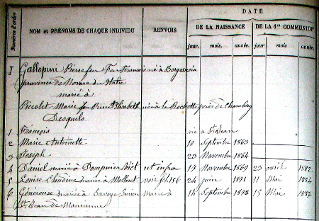 Pierre Galoppini, né à Borgosesia (province de Novare) en Italie (en fait, le Royaume de Sardaigne ne deviendra le royaume d'Italie qu'en 1861), et Marie Picollet, née à La Rochette près de Chambéry, se sont mariés à Saint-Jean-de-Maurienne en 1857, avant le rattachement de la Savoie à la France donc sous la loi sarde. Vue du côté français, Marie aurait ainsi acquis la nationalité « italienne » par son mariage. Quant à leurs 4 enfants signalés vivants en 1876, ils sont catalogués comme « italiens » bien que tous nés à Fontcouverte. Le droit du sol n'existait-il pas à l'époque ? La page 121 du livre de l'Etat de Ames de l'époque nous retrace l'arrivée de ces « italiens » à Fontcouverte au beau milieu des évènements politiques et militaires à l'origine de l'unité italienne et de son corollaire du passage de la Savoie à la France. |