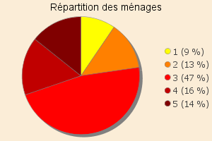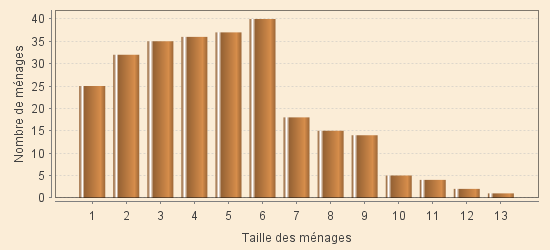 On constate que 44 % de la population vivent dans des « ménages » de 4 à 6 personnes, 16 % dans ceux de moins de 4 personnes, 30 % dans ceux de 7 à 9 personnes et 10 % dans ceux de plus de 9.