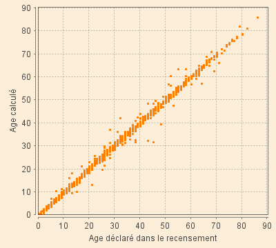 La corrélation entre les âges donnés par le recensement et ceux déductibles de l’état civil est relativement étroite comparativement aux documents de la même nature mais plus anciens : les personnes connaissent leur âge avec une imprécision ne dépassant pas, dans la plupart des cas, ± 2 ans même pour les âges avancés de personnes nées au début du siècle.