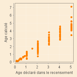 Dans le détail et concernant les âges les plus faibles, le graphique des âges réels en fonctions des âges du recensement confirme l’imprécision de ± 1 an mais on constate également que l’âge donné au recensement n’est pas, contrairement aux habitudes, un âge en années révolues. Il s’agit plutôt d’un âge arrondi à 6 mois près ou plus. Cette imprécision fait que le nombre d’enfants d’âge révolu donné n’est calculable qu’à partir de l’état civil.