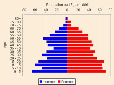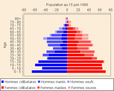 Ainsi, dans la population de 1886, le point le plus marquant est, sans conteste, le grand développement du nombre des célibataires en âge de se marier ou plus âgés se retrouvant dans les familles de type 4 et 5b ou 5d comme élargissement, restés avec leurs parents dans les familles de type 3, regroupés entre célibataires dans les familles de type 2 ou isolés dans les familles de type 1.