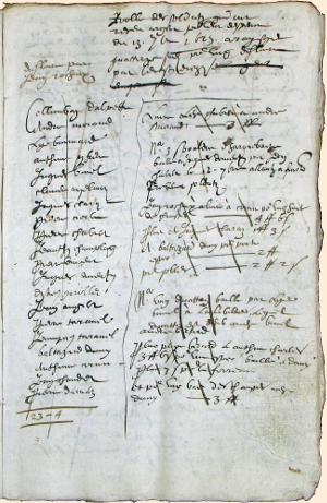 Ensuite, viennent de nombreuses pages peu claires notant les sommes attribuées à ceux qui sont enrôlés à partir des cotisations des autres. Les textes sont peu clairs et probablement répétitifs. Les doutes qui en découlent ne permettent pas d’assurer le nombre des enrôlés (probablement une petite trentaine) et la somme qu’ils reçoivent (exprimée en florins et en sols), ni même la somme totale collectée.