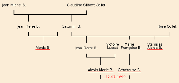 Il est précisé qu'aucune opposition ne s'est manifestée au moment du mariage... ce qui est logique puisque le mariage a lieu. On note encore le cas du mariage d'Alexis Marie Bouttaz et de Généreuse Bouttaz, le 12 juillet 1899, dans lequel les époux sont cousins germains... mariage que permet la république. Le maire aurait pu s'en douter, les époux étant tous les deux de Pierre Pin, et le mentionner. En tout cas, à l'époque sarde, il aurait fallu une dispense du Pape... et encore ! Les deux témoins, de nouveau des Bouttaz prénommés Alexis, sont bien l'un oncle comme dit dans l'acte mais l'autre présenté comme « cousin germain des époux » est seulement issu de germain mais simultanément des deux époux. Les mariages Bouttaz se font en famille avec contrat de mariage... vieilles habitudes de notaire !