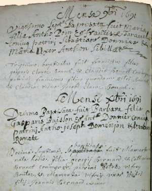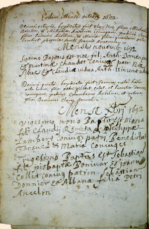 Ci-contre, un des « originaux » aux multiples rédacteurs de fin 1692, ceux du Curé Claude Monod deux ans avant sa mort (son écriture devient moins sure), aidé par son vicaire Jean-Baptiste Favier.