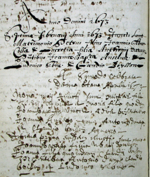Voici la très belle écriture d'un vicaire, resté anonyme, du Curé Antoine Augert rappelant, un peu, en 1673, les ateliers des copistes médiévaux (l'usage habile des pleins et déliés à la plume d'oie est parfois bien gênant quand l'encre traverse la page !), écriture suivie par celle moins immédiatement lisible du Curé Augert au terme de ses jours.