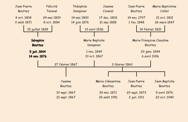 Epouse : Marie Françoise Claudine Bouttaz (25 ans, née le 29 janvier 1844, du Chef Lieu, cultivatrice, n'a pas signé), fille de Jean Pierre (décédé le 1er décembre1848) et de Marie Baptiste Gilbert Collet (décédée le 26 mars1847) |