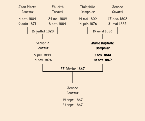 Mariée (22 ans) avec Séraphin Bouttaz (22 ans) le 27 février 1867 à Fontcouverte ![]() |