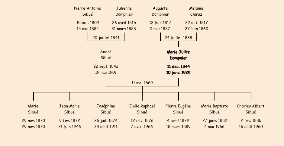 Epoux : André Sibué (26 ans, né le 22 septembre1842, cultivateur à la Bise, a signé), fils de Pierre Antoine (cultivateur, a signé) et de Julienne Dompnier (cultivatrice, n'a pas su signer) |
