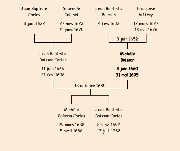 Mariée (25 ans) avec Jean Baptiste Boisson Carles (20 ans) le 18 octobre 1685 à Fontcouverte ![]() |