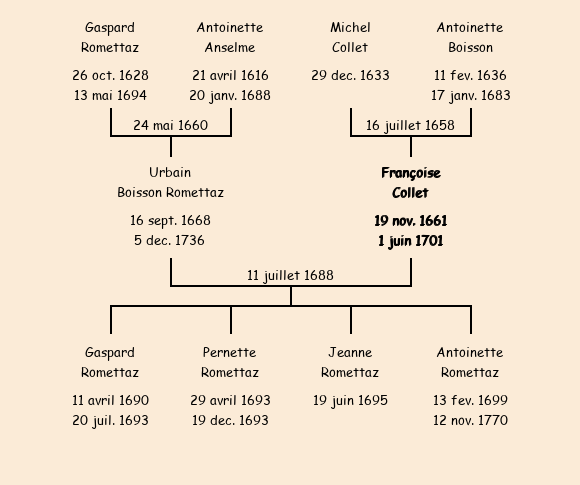 Mariée (26 ans) avec Urbain Boisson Romettaz (19 ans) le 11 juillet 1688 à Fontcouverte ![]() |