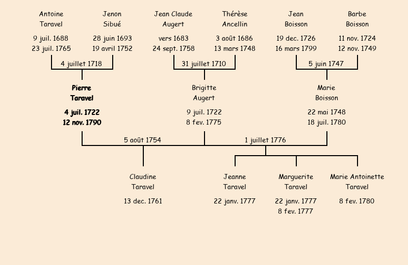 Epoux : Pierre Taravel (veuf de Brigitte Augert fille de Jean Claude dédédé), fils de feu Antoine |