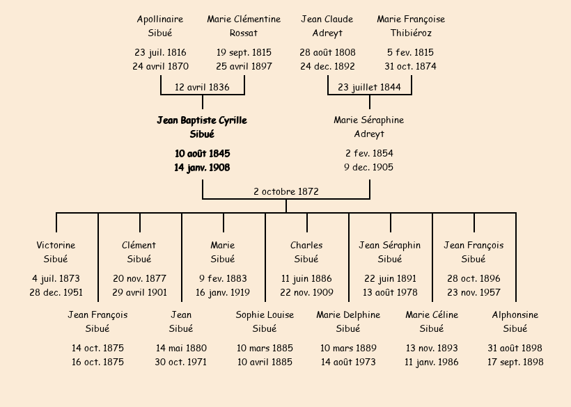 Epoux : Cyrille Jean Baptiste Sibué (27 ans, né le 10 août1845, soldat de l'armée d'active, a signé), fils de Apollinaire (décédé le 24 avril1870) et de Clémentine Rossat (ménagère, n'a pas su signer) |